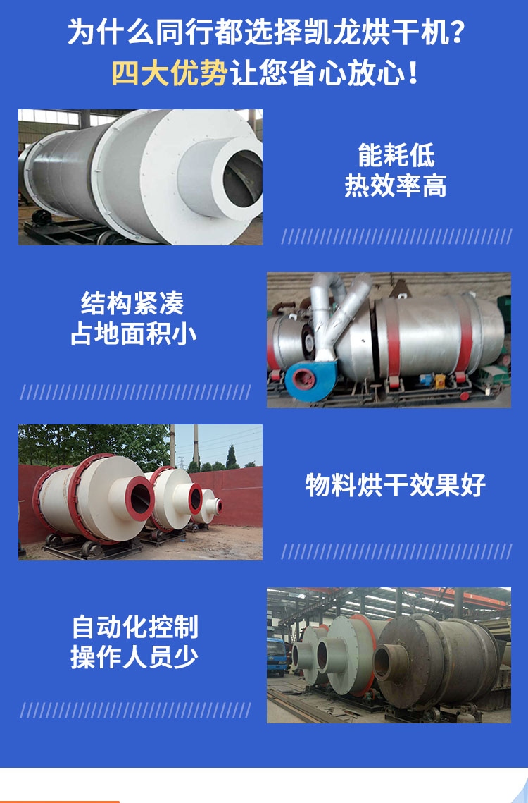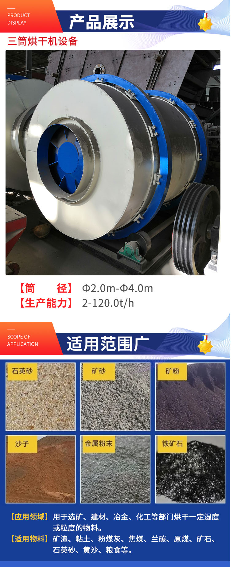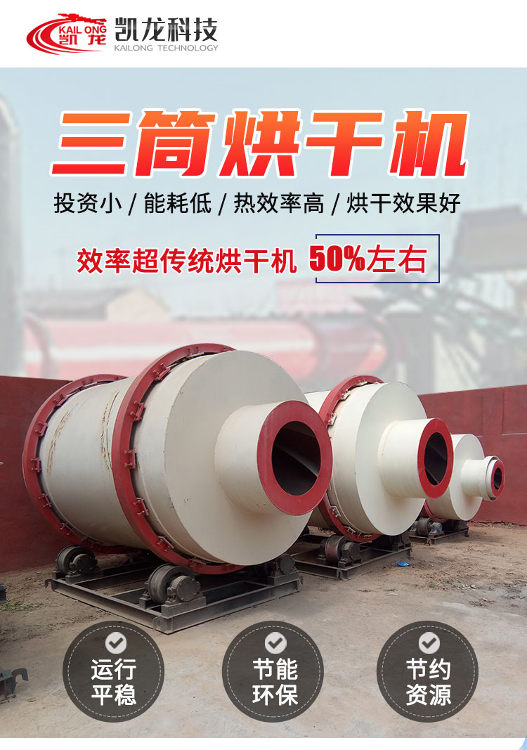 三筒式烘干机具有结构紧凑、构造简单、布局合理,提高物料与热能的热交换率,使物料烘干效果好;基础投入少,仅是相同产量单筒烘干机的二分之一,减少了一次性投入;运行可靠、能耗低、热效率高;同时,容易实现自动化控制,减少操作人员,节约劳动力资源。