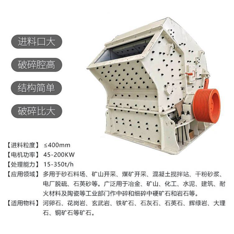 反击式破碎机是一种新型效率高的破碎设备,其特点是:体积小、构造简单、破碎比大、耗能少、生产能力大、产品粒度均匀、并有选择性的碎矿作用,是很有发展前途的设备。 反击式破碎机 优势: 1、特制背板,坚固耐用 通用采用新型材质转子背板,背板能承受转子极高的转动惯量和锤头的冲击破碎力。 2、超大料口,更高