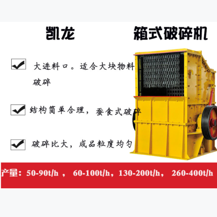箱式破碎机采用先进的生产技术,实现一次投料成型,具有节能环保之特点。成料能按照需求进行调整,粗、中、细、各种规格齐全;无片状、无光滑体、多角多棱保正抗压强度。特别适应于高速公路,建筑及大型工程用料。该破碎机去掉了鄂式机的初破过程,成为大小物料一次完成破碎的新机型,产量大、效率高、动力小、节约了人力物力,降低了物料的破碎成本。