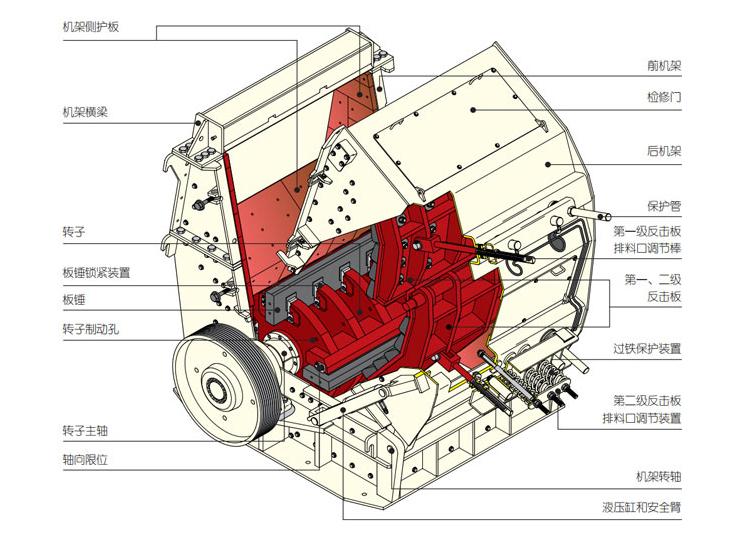 反击式破碎机主要是利用冲击能来达到物料破碎的目的。当物料进入板锤作用区时,受到板锤的高速冲击而破碎,并被抛向安装在转子上方的反击装置上再次破碎,然后又从反击衬板上弹回到板锤作用区重新破碎。此过程重复进行,直到物料被破碎至所需粒度,由机器下部排出为止。调整反击架与转子架之间的间隙可达到改变物料出料粒度和物料形状的目的。