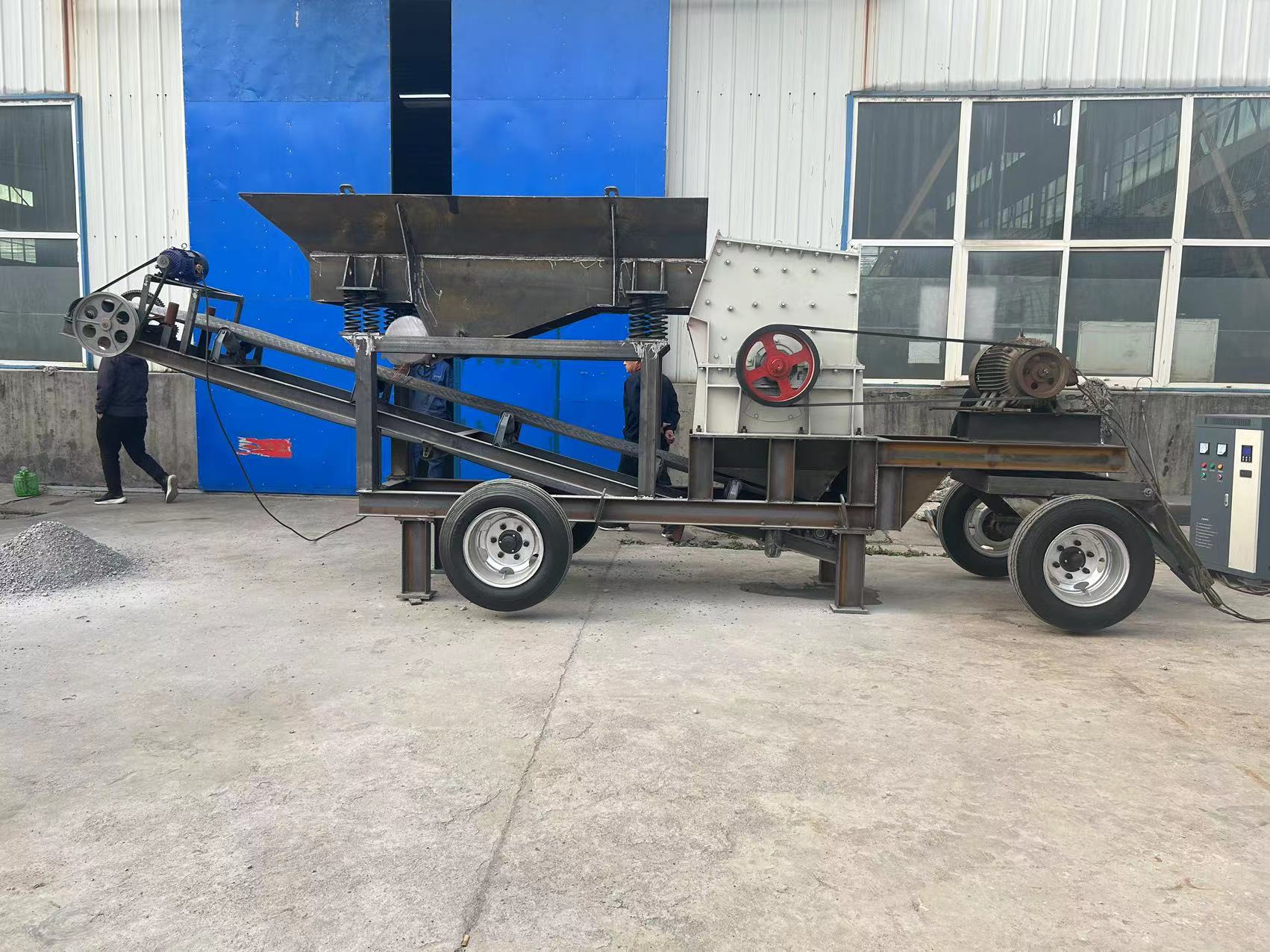 移动式破碎机的行走方式是通过车头牵引至生产场地,无需打桩,无需处理场地,可直接进入生产的,配备的主要石头破碎设备可以是不同类型,如鄂式破碎机、