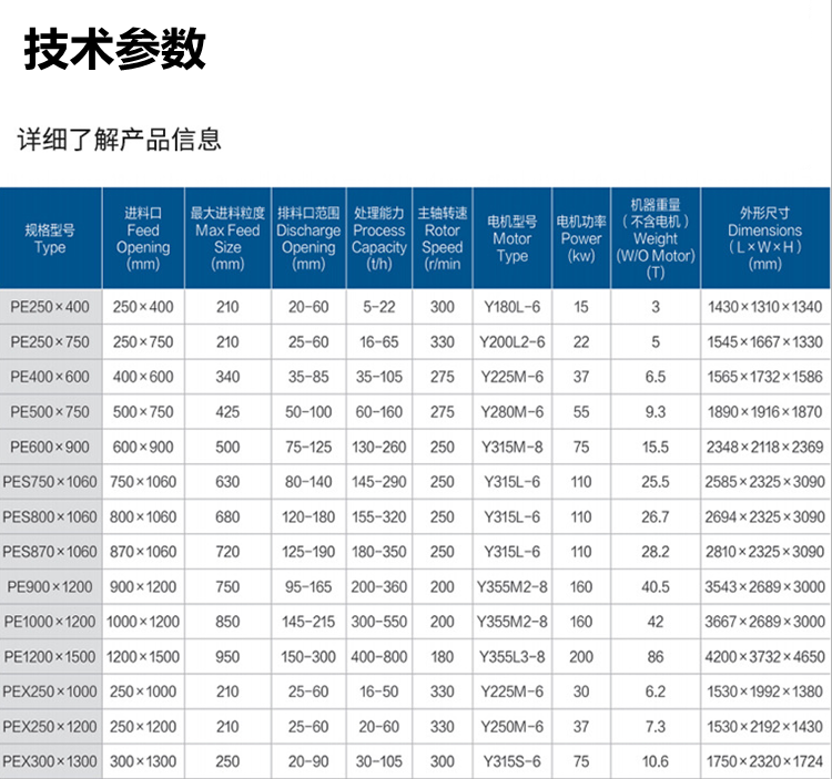 破碎机按其外形规格尺寸及时产量高低的不同,常可划分出很多规格型号,另外,为了满足部分高要求客户生产需求,市场现又推出了一类移动式鄂破机,鄂破机参数详情如下表:
