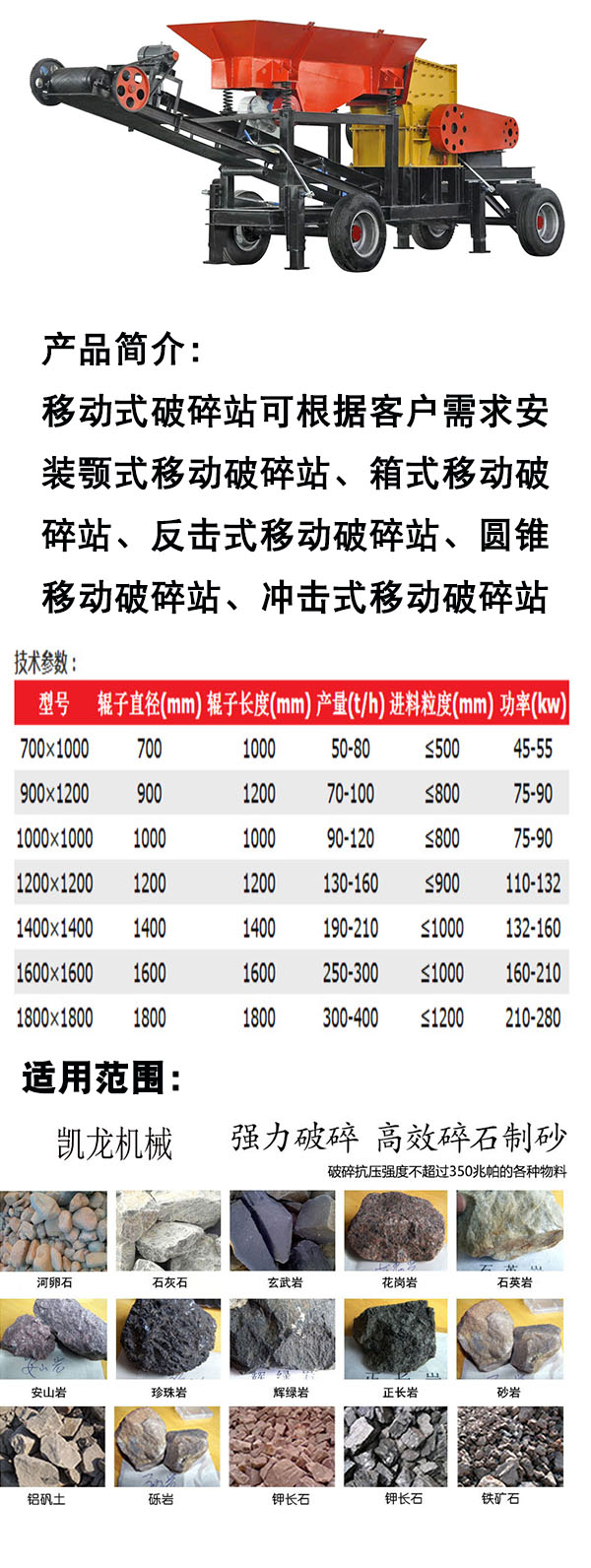 厂家直销移动式破碎站又称移动式破碎机,是一种新颖的岩石破碎设备,大大拓展了粗碎作业概念领域,把消除破碎场地、环境带给客户破碎作业的障碍作为首要的解决方案,并为客户提供高效低成本的项目运营硬件设施。移动破碎机可直接选定场地,直接开到现场,不需运输,直接达到成品粒度。适用物料:建筑垃圾、玄武岩、花岗岩、铁矿石、鹅卵石、大理石、页岩、沙岩、石英石、石灰石、铜矿石、锰矿石、煤矸石、混凝土破碎处理等。